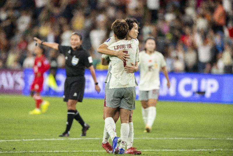 3月3日,中国队球员张睿(后)与队友王霜拥抱庆祝进球。新华社发